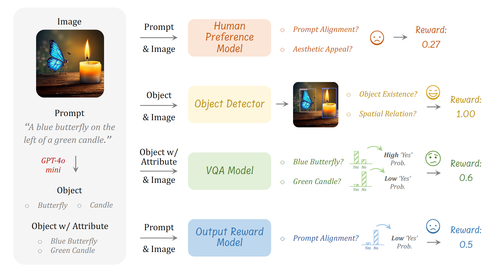 Output Reward Model (ORM):判断图像与提示整体是否对齐。