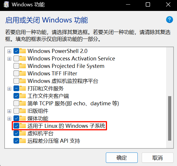 注意:需要在windows功能中开启“Hyper-V”和“适用于Linux的Windows子系统”功能
